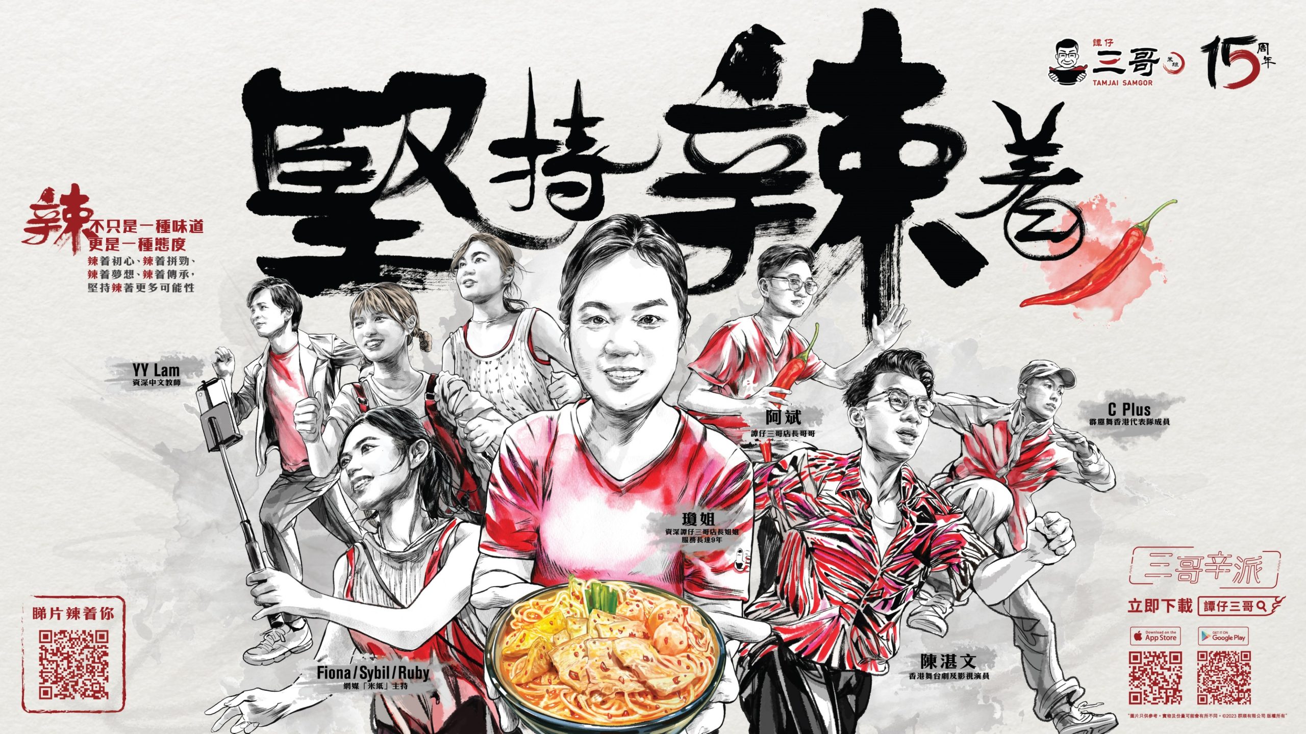譚仔三哥15周年第一浪宣傳活動由香港出發,率先推出《堅持辣着》宣傳短片,不但邀得林海峰擔任旁白,更請來多位在不同範疇「堅持辣着」的名人及KOL參與拍攝,包括實力派演員陳湛文(Peter)、星級補習名師YY LAM林溢欣、《米紙》三位女主持Fiona、Sybil、Ruby,以及曾參加《全民造星V》的香港代表隊霹靂舞運動員C Plus,眾人無懼「熱辣辣」的天氣,堅持以認真投入的態度,於盛夏在香港各區奔跑揮發汗水,完美呈現「堅持辣着」的匠人精神。